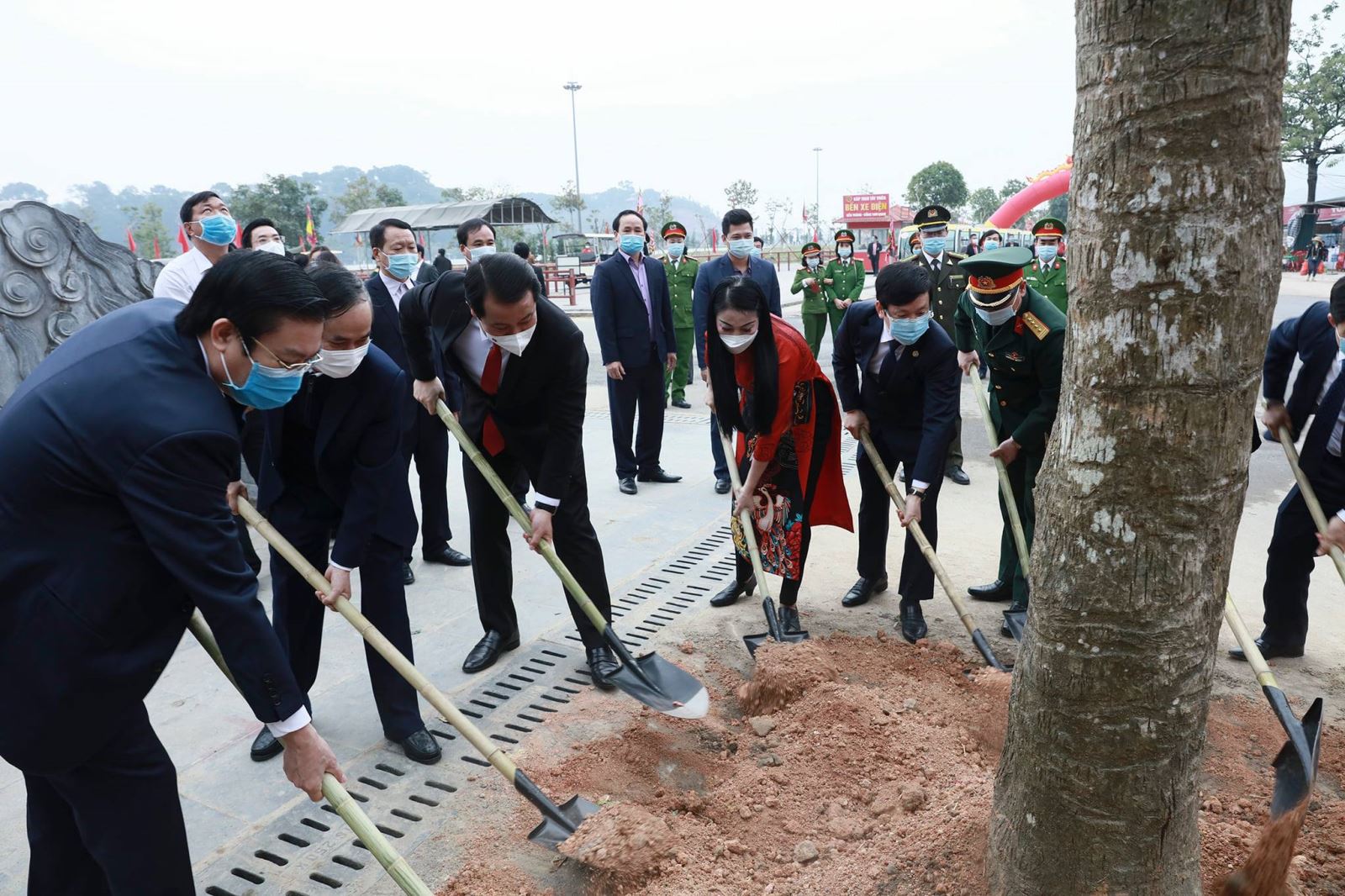 Các đồng chí lãnh đạo tỉnh, lãnh đạo huyện Tam Đảo trồng cây tại cổng đền Trình