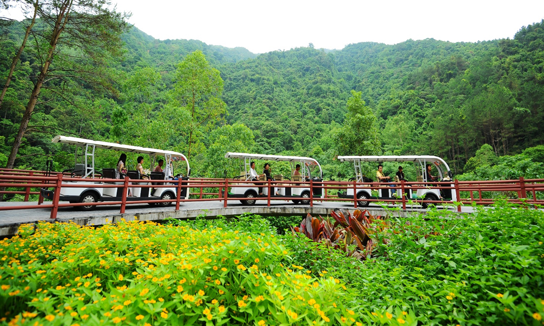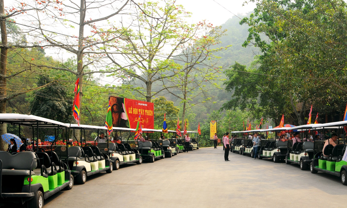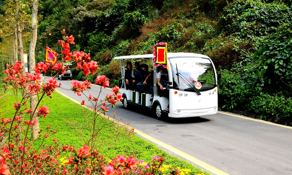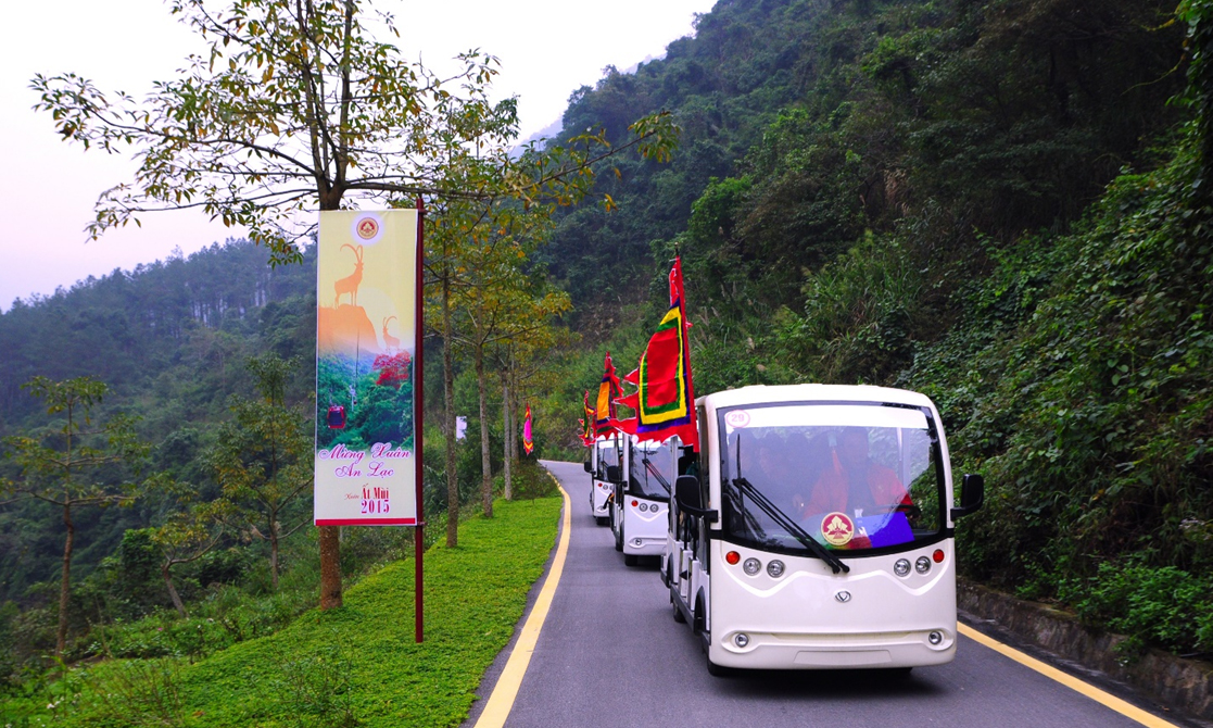 Hệ thống xe gắn động cơ điện, chạy bằng ắc-quy an toàn và thân thiện với môi trường. Xe điện được thiết kế kiểu gầm thấp, không có cửa nên gọn nhẹ, thoáng mát tạo cảm giác êm nhẹ và thoải mái cho du khách, nhất là người già, trẻ em và người tàn tật trên hành trình “Đến với Phật về với Mẫu”.